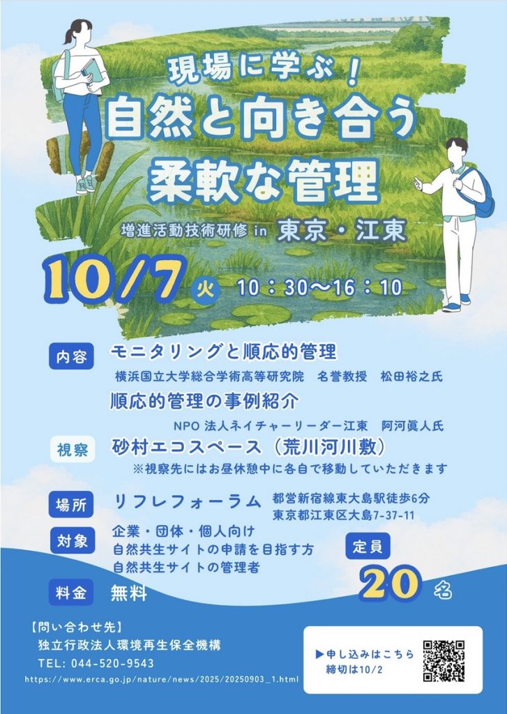 研究イベント環境再生保全機構主催イベント「現場に学ぶ!自然と向き合う柔軟な管理」で松田裕之教授が講義(令和7年10月7日) 環境再生保全機構主催イベント「現場に学ぶ!自然と向き合う柔軟な管理」で松田裕之教授が講義(令和7年10月7日) 独立行政法人 環境再生保全機構の主催で令和7年10月7日に行われた増進活動研修「現場に学ぶ!自然と向き合う柔軟な管理」で松田裕之教授が「モニタリングと順応的管理」と題する講義を行いました。