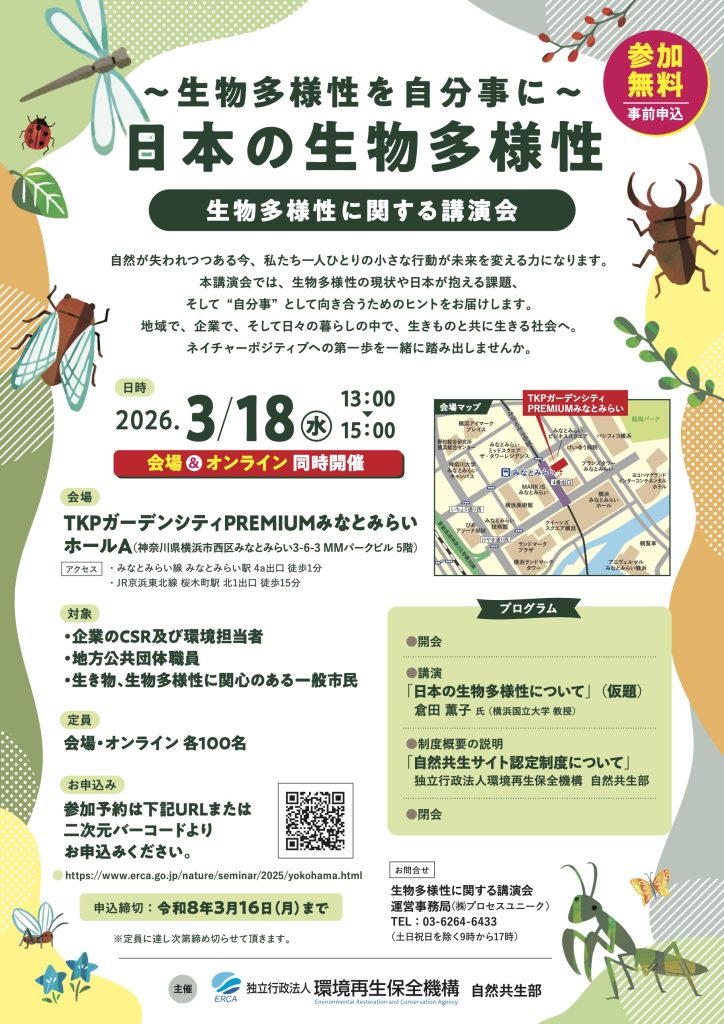 On March 18, 2026, a lecture on biodiversity organized by the Environmental Restoration and Conservation Agency, will be held in Minato Mirai, Yokohama, where Prof. Kaoruko Kurata will give a lecture ”The current state of biodiversity, the challenges facing Japan, and the importance of seeing it as a personal issue”.