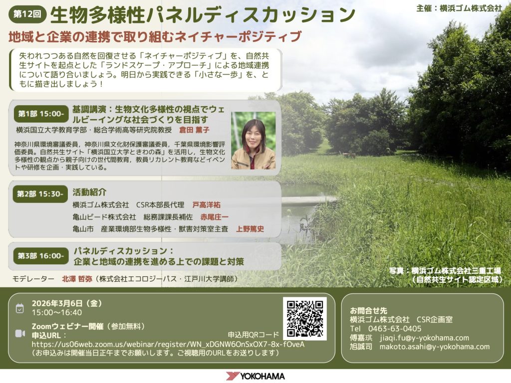The 12th Biodiversity Panel Discussion webinar, titled “Working Toward Nature Positive Through Collaboration Between Communities and Companies,” hosted by Yokohama Rubber Co., Ltd., was held on March 6, 2026. Professor Kaoruko Kurata delivered a keynote lecture titled “Aiming to Build a Well-Being Society from the Perspective of Biocultural Diversity.”